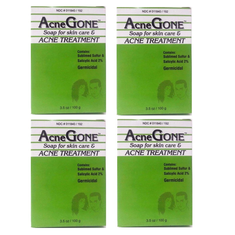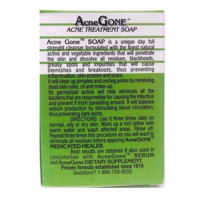 Contains Sublimed Sulfur & Salicylic Acid 2% Germicidal. Acne Gone SOAP is a unique every day full natural active, and vegetable ingredients that will penetrate the skin and dissolve all residues, blackheads, greasy spots, and impurities that will cause blemishes and breakouts, thus preventing inflammation, skin erosion, and scars. It will clear up pimples and unclog pores by removing dead skin cells, oil, and makeup. Its germicidal action will help eliminate all the bacteria that are responsible for causing the infection and prevent it from spreading.