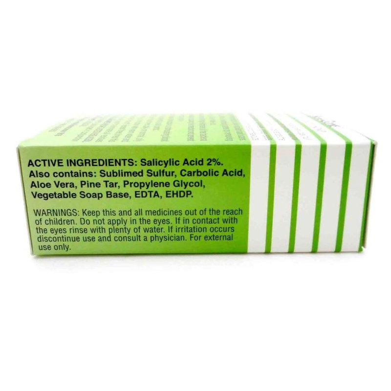 Active Ingredients: Salicylic Acid 2%. Also contains: Sublimed Sulfur, Carbolic Acid, Aloe Vera, Pine tar, Propylene Glycol, Vegetable Soap Base, EDTA, EHDP.