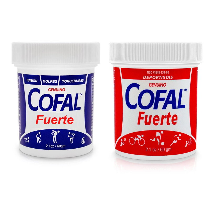 The primary difference is the intended use and strength: Cofal Fuerte Red is a stronger formula for muscular pain and arthritis, while Cofal Original Blue is for cold symptoms and general discomfort. A green version is also available for general muscle relief and use before sports.