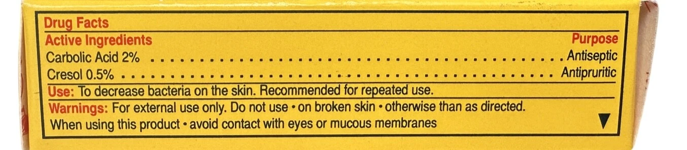 Main Ingredients: Carbolic Acid 2% Antiseptic, Cresol 0.5% Antipuritic