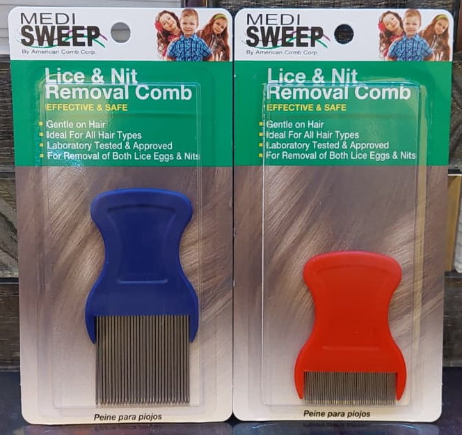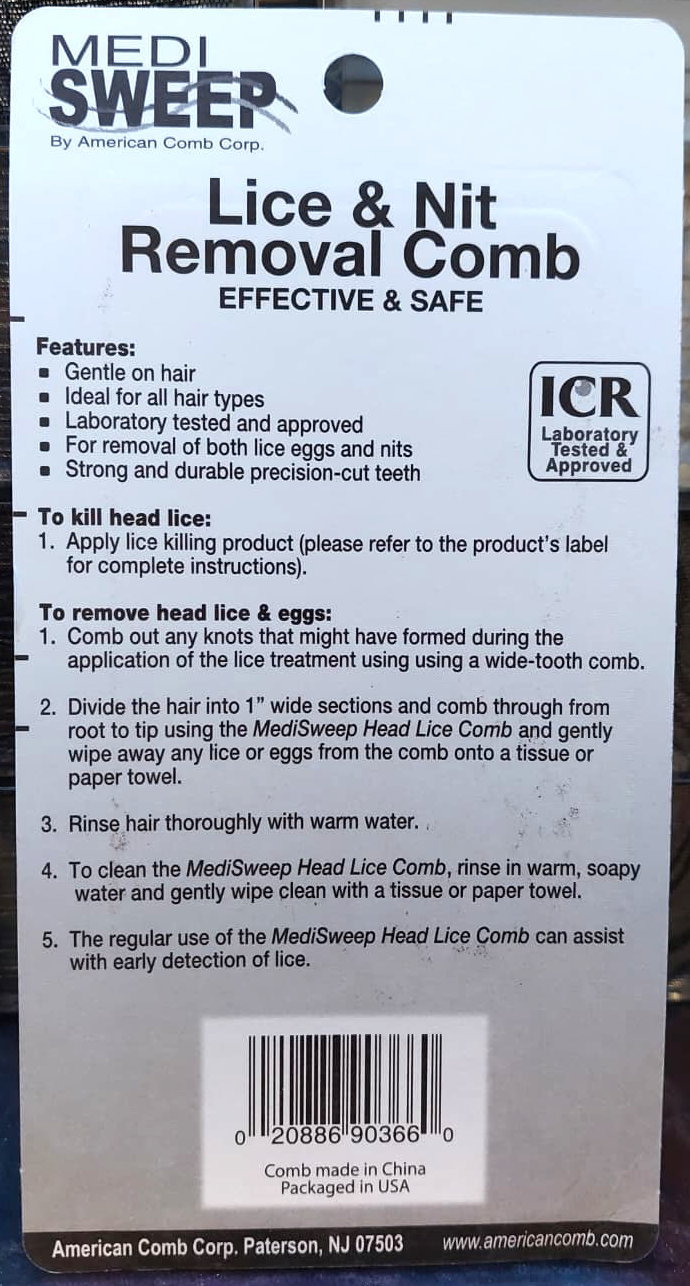 The Medi-Sweep lice and nit comb (often by PharmaSystems) is a durable, stainless steel comb with fine, closely spaced teeth designed to physically remove head lice, eggs (nits), and shed skins from hair, working alongside or after chemical treatments for complete removal, featuring rounded teeth for scalp comfort. Its precision-engineered teeth and sturdy build make it effective for all hair types, preventing re-infestation by ensuring thorough root-to-tip cleaning.